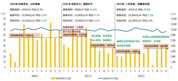 图1:2020.01-2022.12贵阳七城区商品住宅销售面积、备案成交均价走势