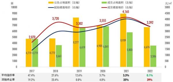 备注1:仅统计含住宅可开发体量地块(纯住宅、商住用地),不含纯商业、工业及其他用地;2017-2021年公告量(包含终止及流拍)按起始时间统计、2022年公告量按交易时间统计,历年成交量均按交易时间统计