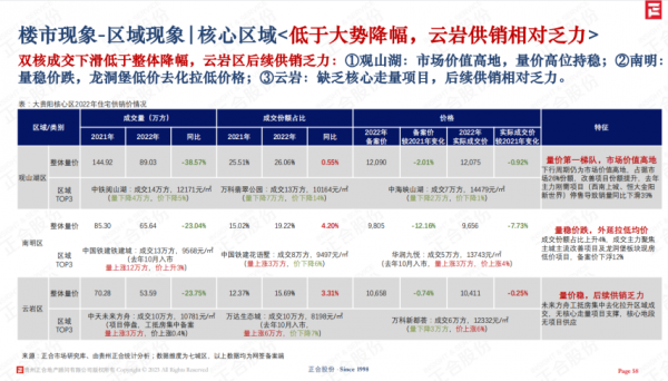 双核区+白云区:成交269万㎡,占整体销量79%,同比下滑32%,低于贵阳整体降幅(40%),量价相对具备支撑;观山湖为市场量价第一梯队,老城外延板块(南明龙洞堡&云岩三马及小关)为主力去化,降幅仅2成左右,白云承接观山湖外溢,大盘稳去化。
