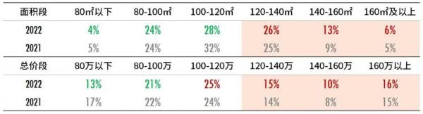 表2:2021年、2022年贵阳七城区商品住宅分面积段、总价段成交套数占比