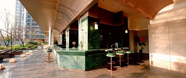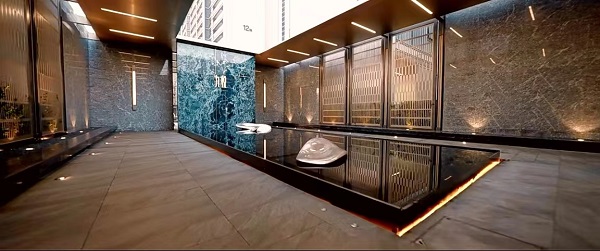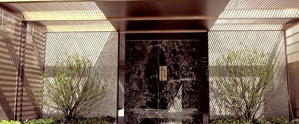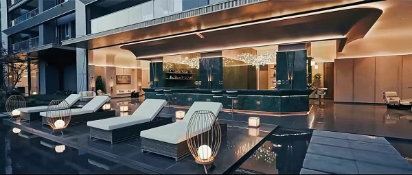 约699平超大水景与6重叠瀑交错,极具灵动感;迎客前廊屏风全为激光切割,特选黑山石和泰山石;6棵单价10万以上全冠移植的特选朴树点缀其间,呈现自然艺境。
