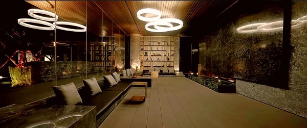 室内约316平户外会客厅,与自然相容的美好场域,墙面采用印度蓝眼睛石材与范思哲黑进口石材,下沉式设计,与自然界线消融处理。