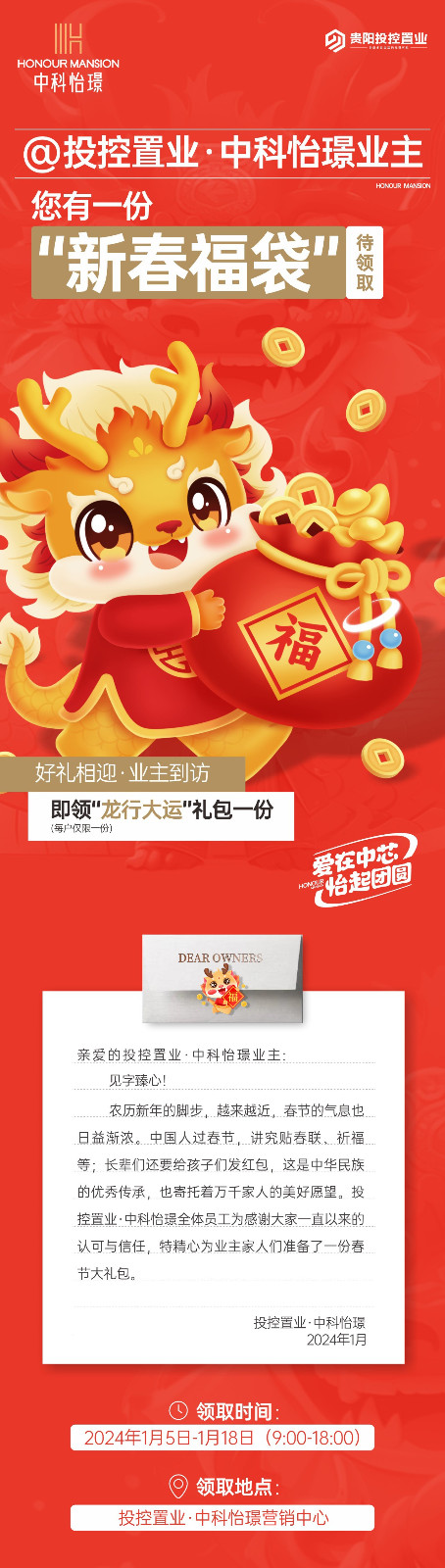 1月10日,据投控置业中科怡璟官微消息,为感谢大家一直以来的认可与信任,特精心为业主家人们准备了一份春节大礼包,1月5日-18日期间,在投控置业中科怡璟营销中心可领取大礼包。