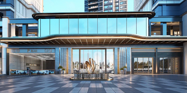约30m威仪门庭,兰花雕塑搭配环岛式奢华水景,营造流动如水的艺术质感;大面积超白玻璃幕,搭配圆角匠艺,加上厚重饱满的幻影灰石材,仿铜色铝板的超宽挑檐等设计,未入门,先仰见新贵礼序。