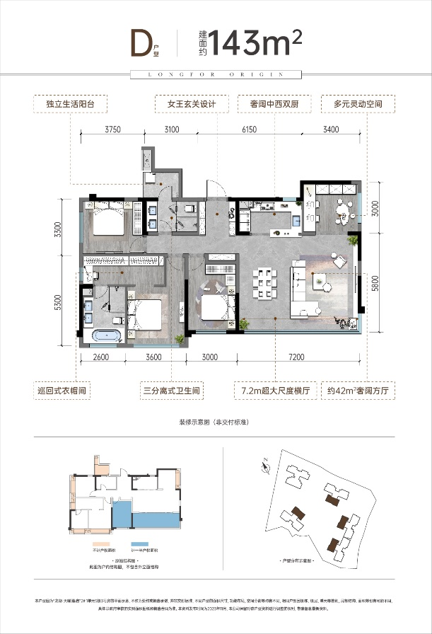 对于追求高品质奢适生活的新贵家庭,龙湖·天曜|峯启打造了建面约125-143㎡宽幕巨厅大平层,无论是恢弘大气的女王玄关,阔尺宽境的LDK一体化客餐厅,还是主卧套房的可巡回式衣帽间,每一点都都为新贵人群提供了更高阶的生活解答。