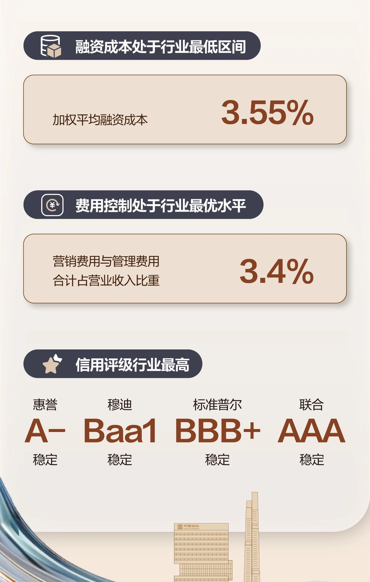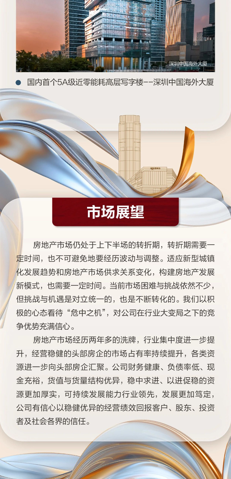 此外,报告还显示,中国海外发展财务健康、负债率低、现金充裕,货值与货量结构优异,稳中求进、以进促稳的资源更加厚实,可持续发展能力行业领先,发展更加笃定,有信心以稳健优异的经营绩效回报客户、股东、投资者及社会各界的信任。