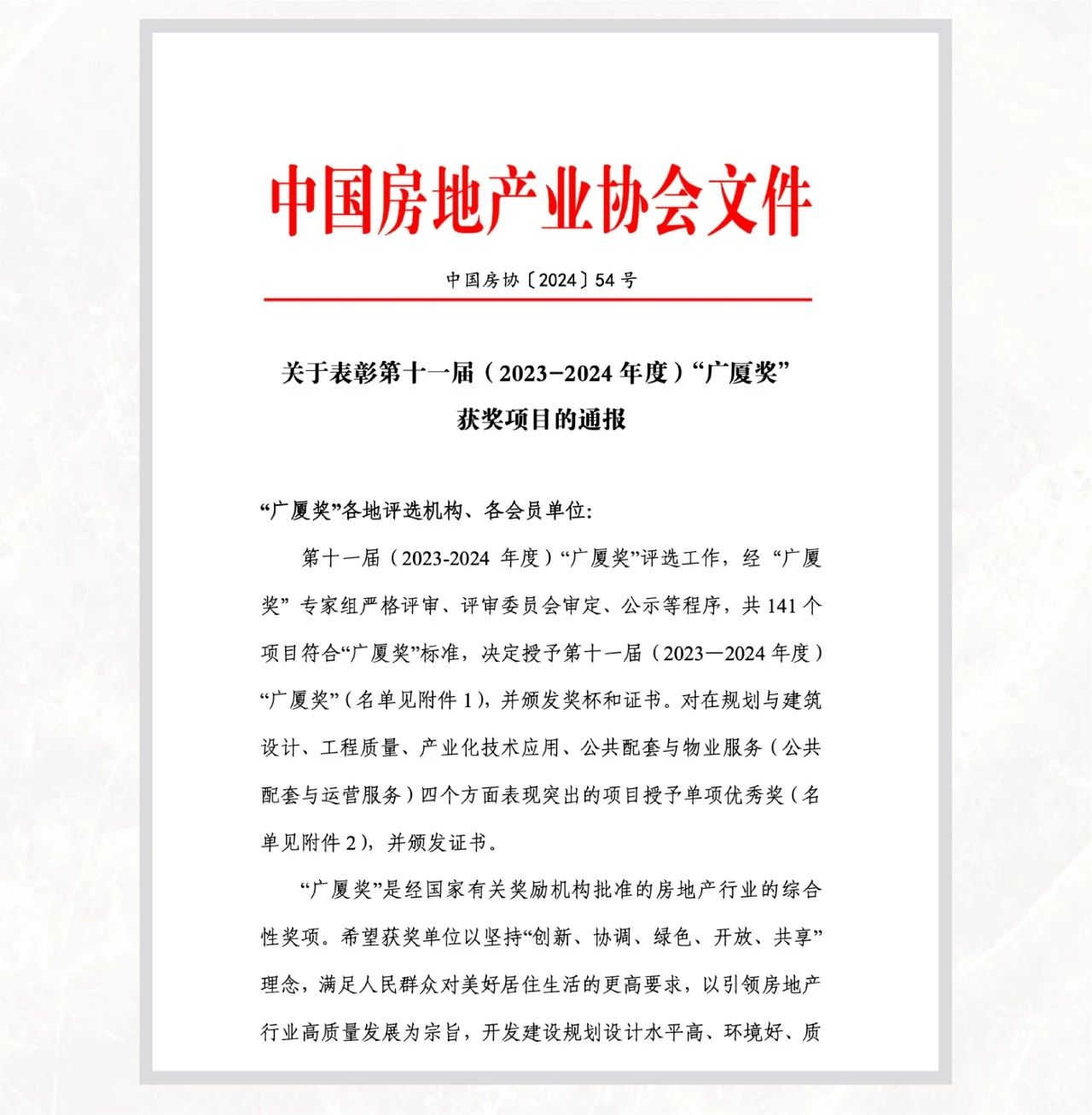 4月9日,中国房地产业协会、住房和城乡建设部住宅产业化促进中心联合发布第十一届(2023-2024年度)“广厦奖"第一批获奖项目名单,万科·翡翠公园在评选中脱颖而出,成功摘取这一中国地产行业综合实力与水准的最高荣誉,同时斩获公共配套与物业服务(公共配套与运营服务)优秀奖。