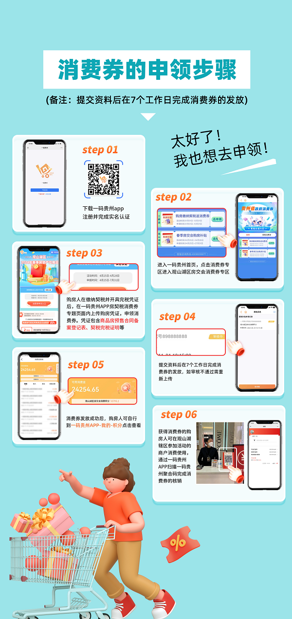 购房补贴活动时间为4月25日至4月28日,消费券申领时间为4月25日至7月31日,可下载一码贵州APP进行申领和使用。购房人在通过购房合同网签备案后,并缴纳完契税,开具完税证明,在一码贵州平台实名认证后上传相关购房凭证(商品房预售合同备案登记表、契税完税证明),可申领购房补贴消费。