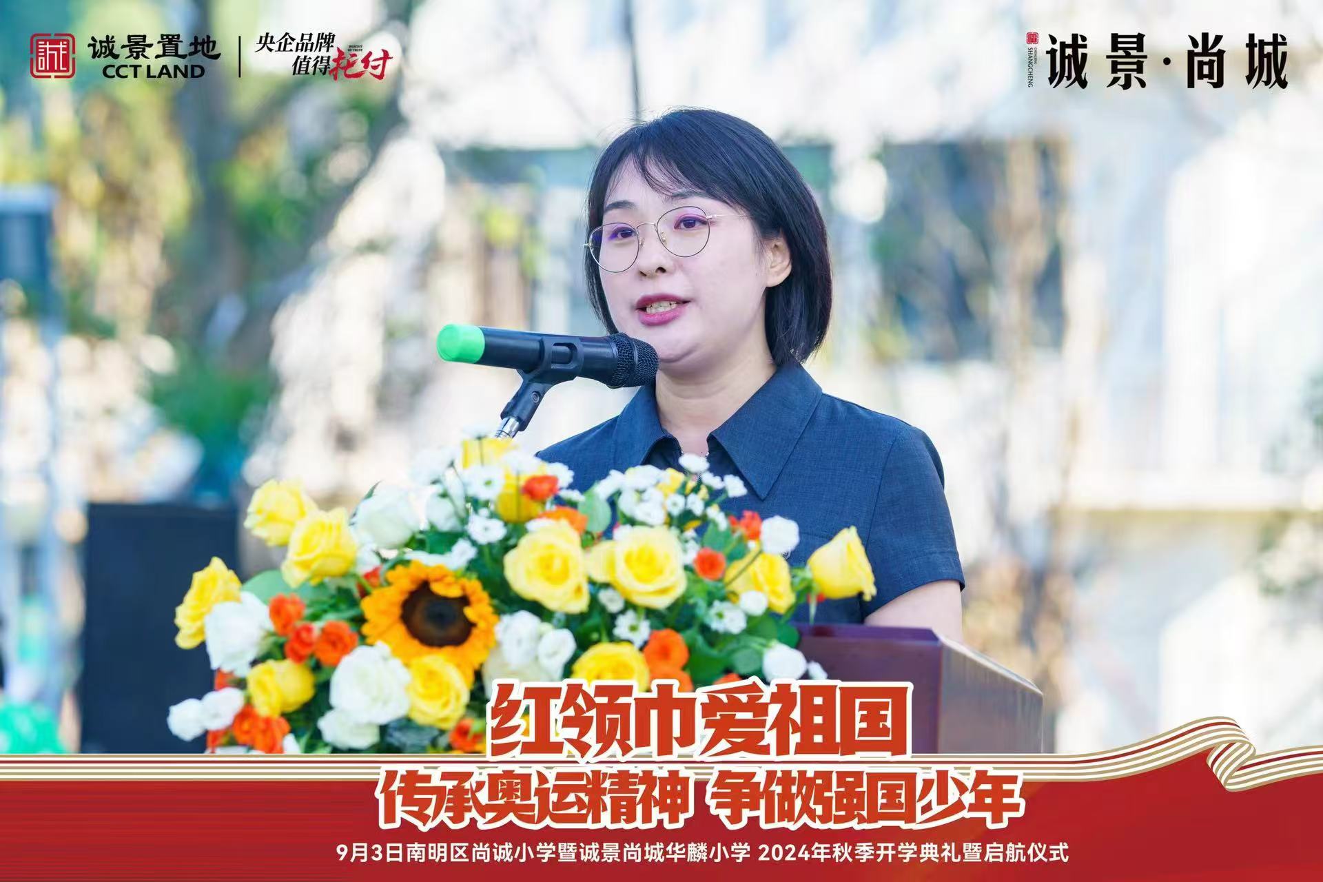 南明区人民政府教育督导室陆恩丽在致辞中表达了对学校前期工作和呈现的实际情况表达了高度的肯定,他指出,南明区尚诚小学(诚景·尚城华麟小学)是南明区教育局寄予厚望的学校,是华麟学校和南明区教育局深度联合的又一优质学校,希望学校能办得越来越好,为南明区教育事业添砖加瓦,并为各位学子送上满满的成长祝福。