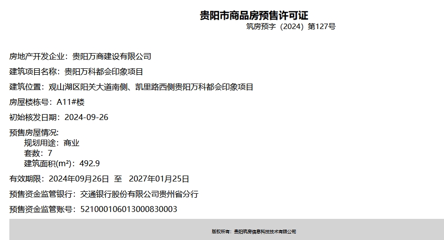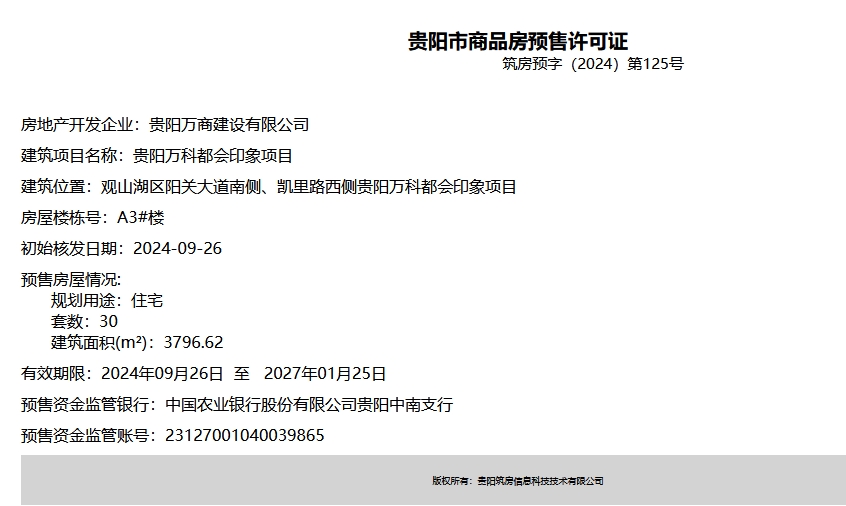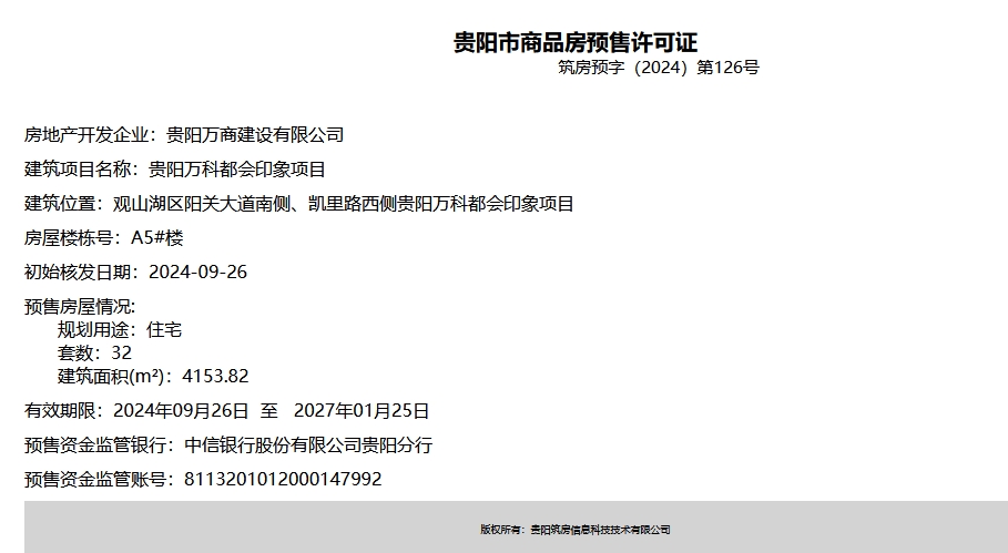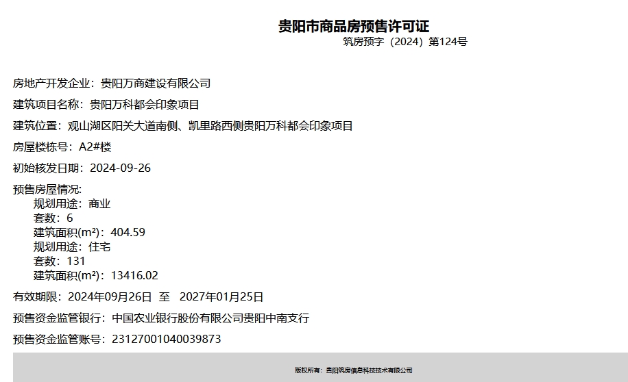 9月26日,据筑房网消息,贵阳万科都会印象项目新获四张预售证,共计193套住宅及13套商业即将入市,建筑面积22263.95m²。
