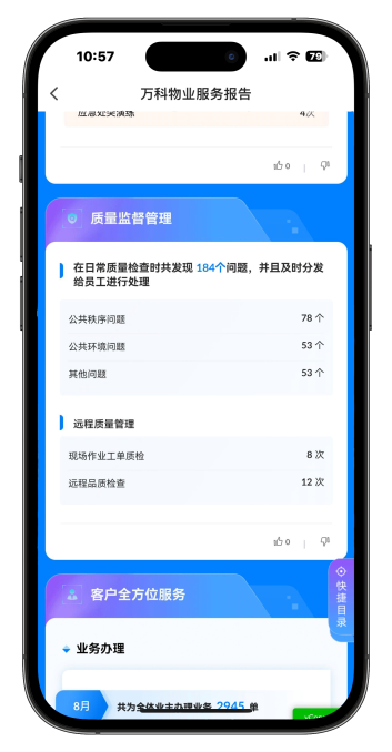 “我们在行业内首创了数字服务报告,承诺的每一项内容,都在这份报告中一一进行呈现。”邹明回复,这个报告会以月为单位自动生成,每一个业主都可以通过“住这儿”APP随时随地查看,报告中包括公共资源收益、小区重大事项进展、公共区域维修、安全秩序巡检、小区文化活动等。