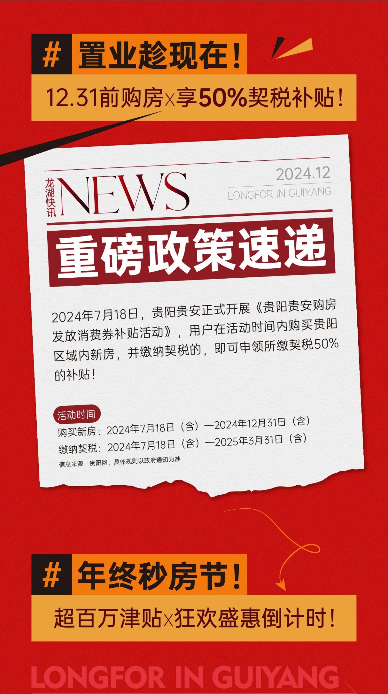 12月23日,据贵阳龙湖官微消息,其5盘联动,2024置业钜惠终极狂欢活动来袭,12月31日前购房可享50%契税补贴。