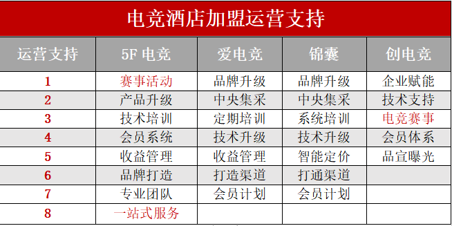 从图表中我们可以清晰地看到前三家的加盟支持业务是相对完善的,而相比较之下有特色的运营支持是电竞赛事和一站式服务。