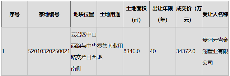 云岩区两宗住宅用地分别被贵阳云岩筑黔房地产有限公司和贵阳六岩天秀房地产有限公司竞得,成交价分别为3.69亿元和2.40亿元,显示出核心区域住宅用地持续受到市场青睐。