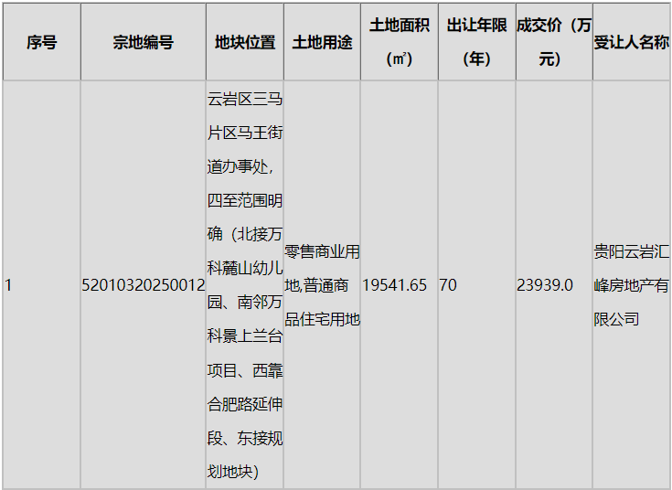 在住宅用地方面,花溪区贵筑街道办事处尖山村地块(编号52011120240218)以8.28亿元的成交价成为本次出让的"标王",该地块面积达132420平方米,由贵阳花溪富远置业有限公司竞得。