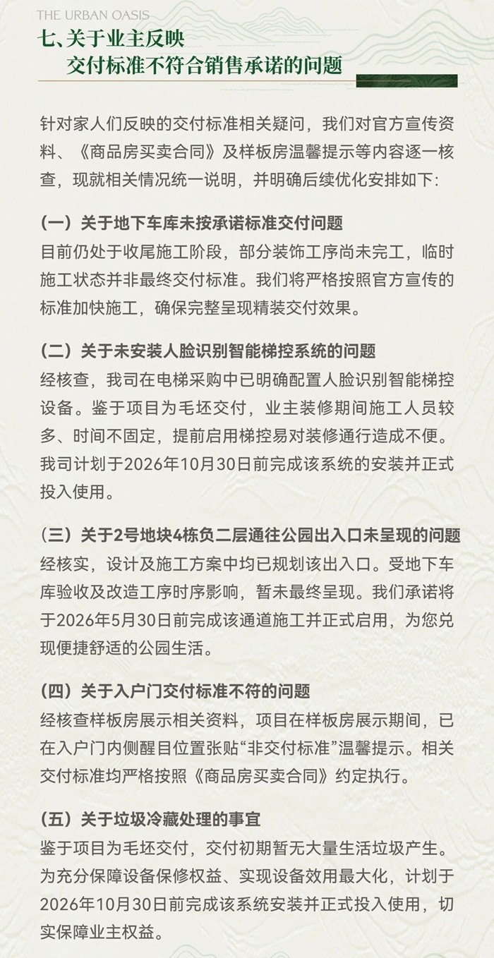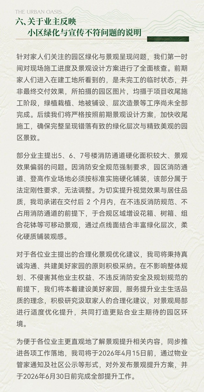 此外,项目方就业主反映的小区绿化与宣传不符、部分交付标准未完全呈现等问题逐一回应,承诺将加快收尾施工,并在今年内完成景观提升、架空层打造、智能梯控系统及垃圾冷藏处理系统安装等多项优化工作,明确了具体时间节点。开发商表示,将秉持央企责任,全力落实各项承诺,接受业主监督。
