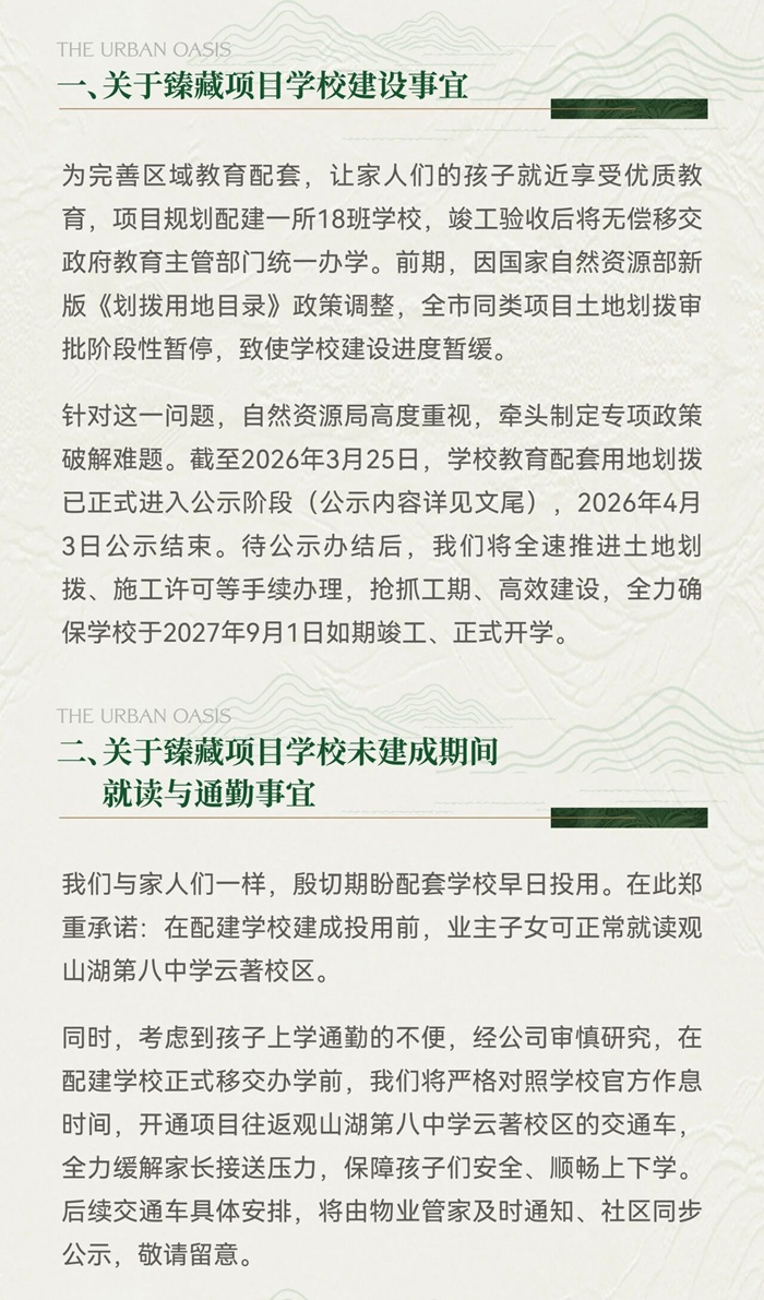 公告显示,针对因政策调整暂缓的配建学校建设,项目方正推进用地划拨公示,并确保学校在2027年9月1日如期开学;同时,在配建学校投用前,业主子女可就读观山湖第八中学云著校区,并将提供往返交通车服务。