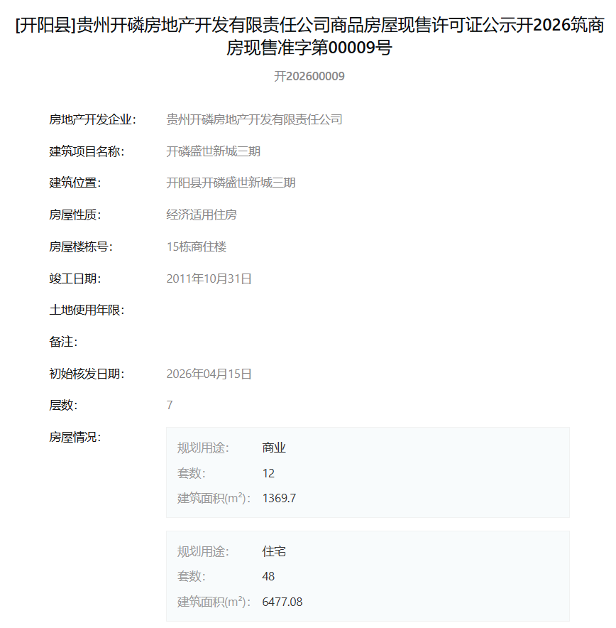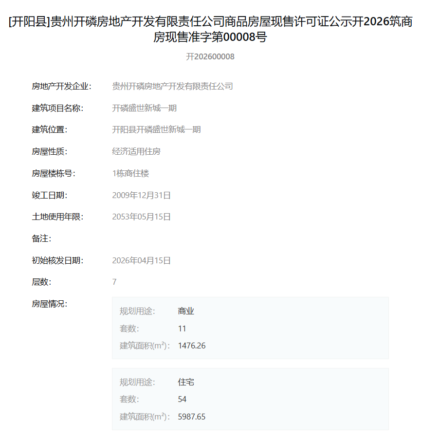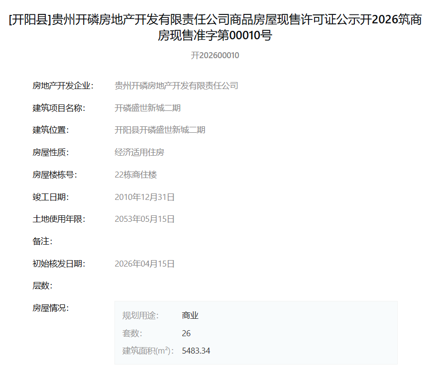 根据公示信息,此次获得现售许可的房屋位于开阳县,性质均为经济适用住房。其中,一期1栋商住楼包含住宅54套、商业11套;二期22栋商住楼为商业用途,共26套;三期15栋商住楼包含住宅48套、商业12套。