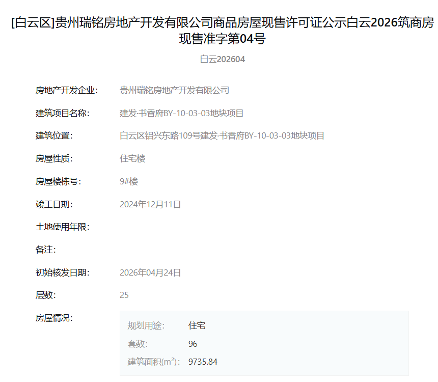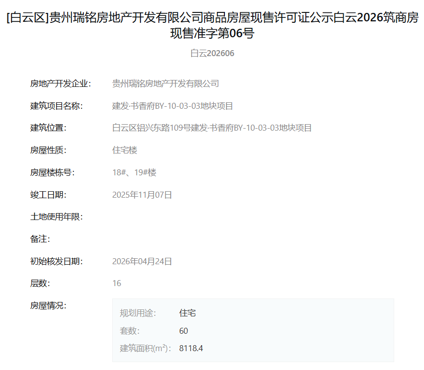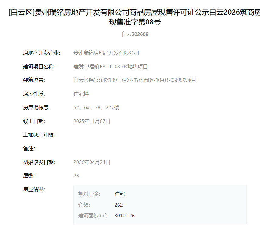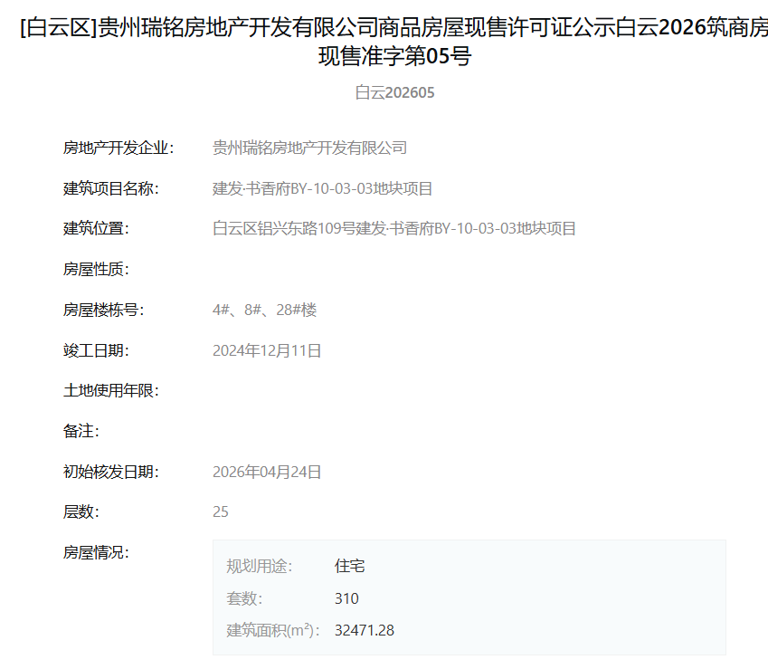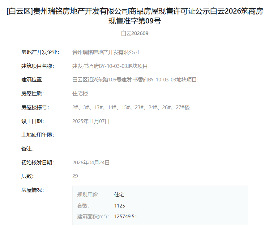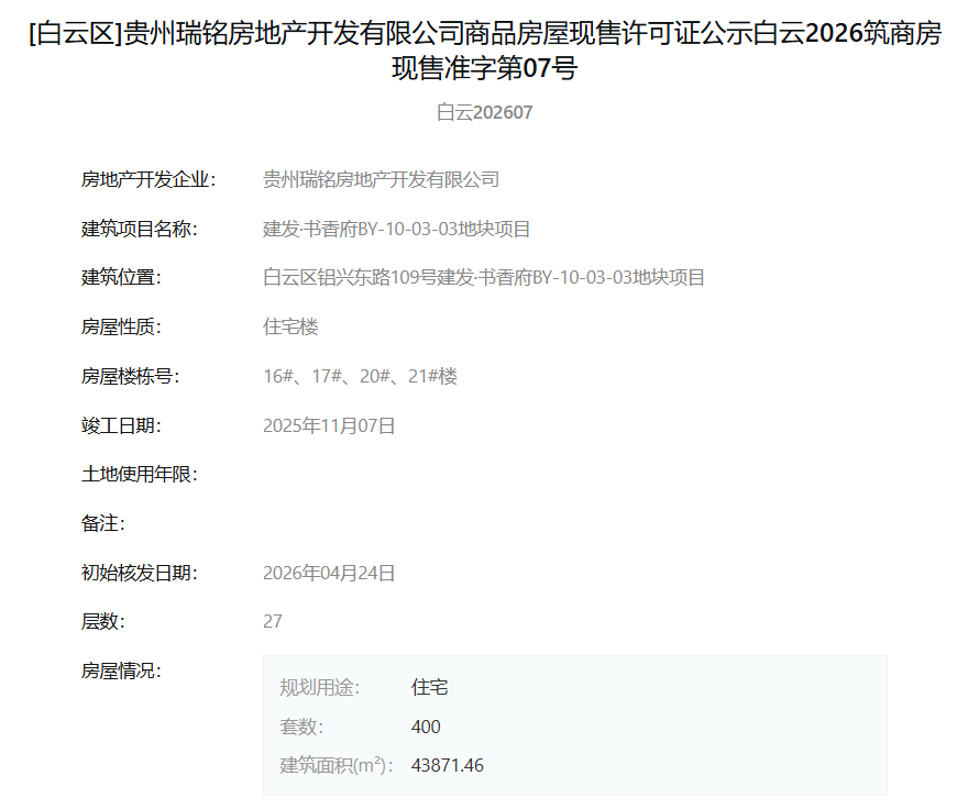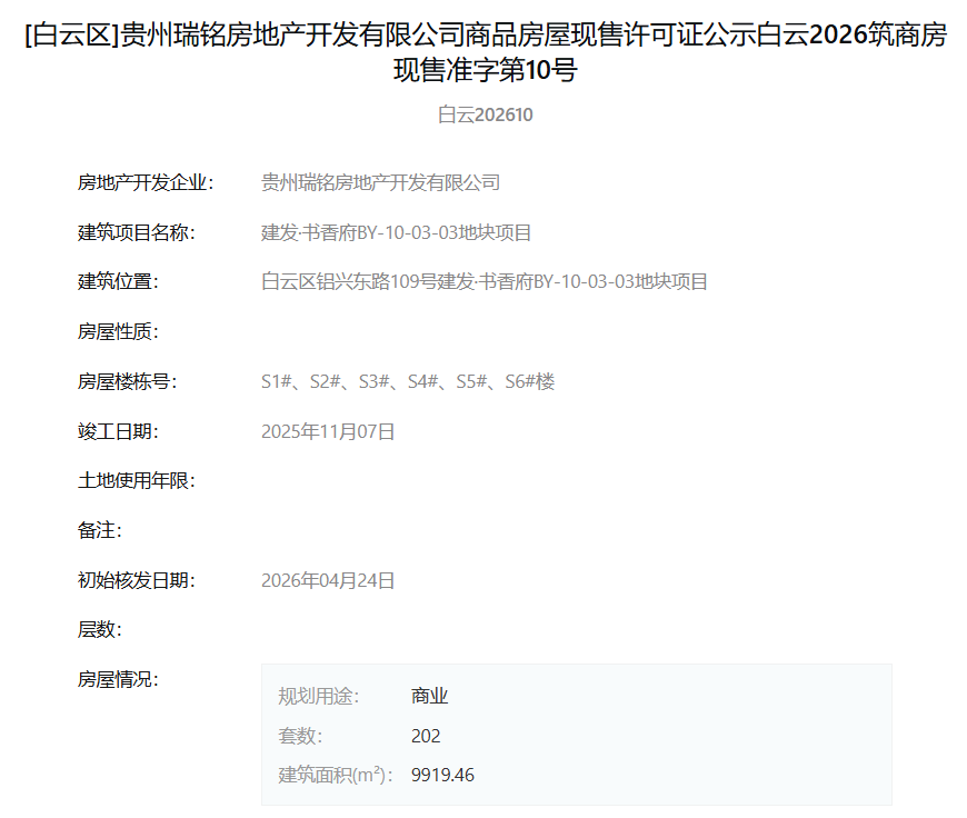 4月30日,据筑房网消息,贵州瑞铭房地产开发有限公司旗下“建发·书香府BY-10-03-03地块项目”于2026年4月24日一次性取得了多张现售许可证。