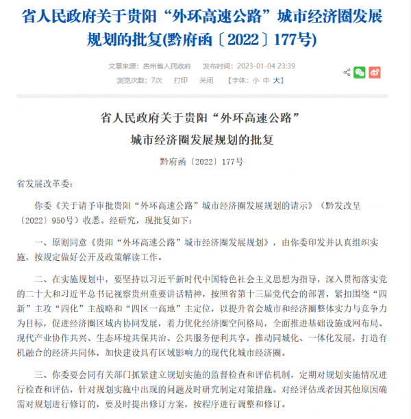 1月4日,贵州省人民政府官网发布了省人民政府关于贵阳“外环高速公路”城市经济圈发展规划的批复(黔府函〔2022〕177号)。