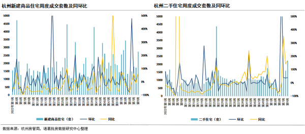 (注:2022年第20周杭州新房环比为661.6%;2022年第7周二手房同比为3628.6%,2023年第6周二手房环比为747.5%)