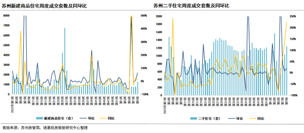 (注:苏州2022年第7周新房成交环比为1007.45%,42周二手房成交环比为339.04%;2023年第6周新房成交同比为721.28%,第6周二手房成交环比为350.98%)