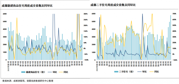 (注:成都2022年第38周新房成交环比为707.14%,二手房成交环比为712.38%;2023年第6周新房成交环比为627.37%,同比为14135.71%)