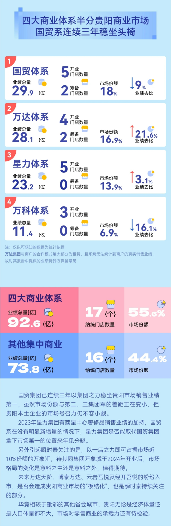 3月6日,瞬时泰团队发布第九届贵阳商业发展报告。根据报告显示,国贸、万达、星力及万科四大商业体系分布贵阳商业市场。其中,国贸体系以29.9亿位居第一。