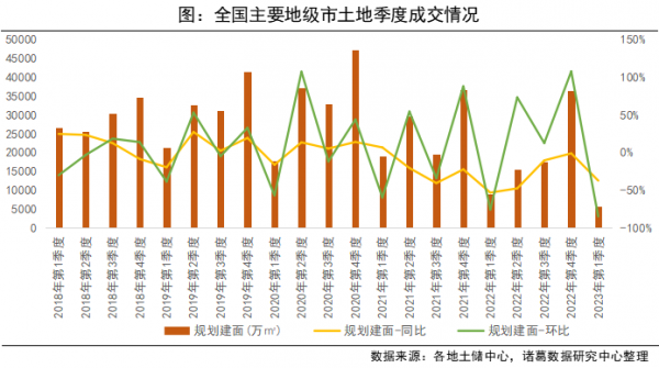 从一季度土地成交表现来看,一季度受到供应规模下降的影响,成交规模较去年同期仍有一定差距。据诸葛数据研究中心监测,2023年一季度全国主要地级市土地成交规划建筑面积为5662.16万㎡,同比下降37.08%。预计随着接下来土地供应闸门进一步放开以及房企资金情况改善,土地成交有望在二季度扭转同比下滑局势。