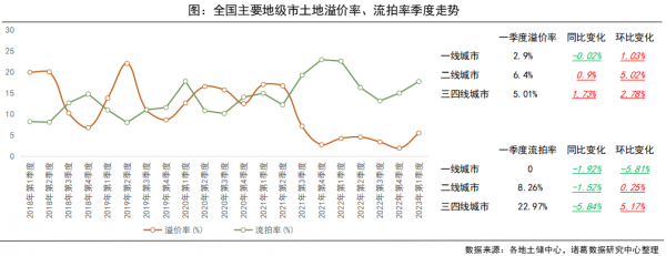 从一季度溢价率与流拍率来看,房企拿地热情上升,流拍现象好转,溢价率呈现明显上升趋势,流拍率较去年同期下降明显。数据显示,2023年一季度全国主要地级市溢价率为5.46%,环比上一季度上升3.6个百分点,较去年一季度上升1.29个百分点;流拍率为17.71%,较上一季度上升2.76个百分点,较去年一季度下降4.86个百分点。