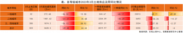 从地块性质来看,3月各类用地供应规模均较上月上升,其中商办用地涨幅居首,为56.34%。分各能级城市来看,2023年3月,各等级城市供地量环比全线上涨,且三四线城市涨幅居首。其中,在北上广深4城持续推出地块的带动下,一线城市整体供应量再度上升;二线、三四线城市供应规划建筑面积环比涨幅均超30%。推出楼面价方面,一线城市推出楼面价环比独升,二线、三四线城市双双延续下滑态势。