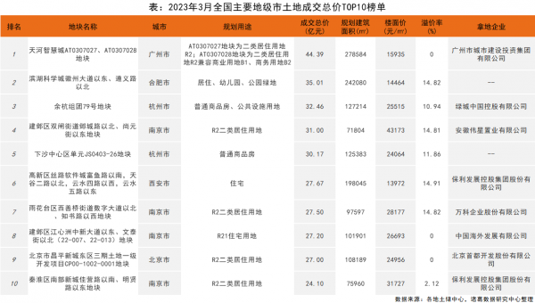 地块成交总价TOP10榜单中,共覆盖了广州、合肥等6个城市,且南京地块上榜率靠前,占据4席。从溢价情况来看,7宗溢价成交,其中有6宗溢价率超10%,另外3宗底价成交。其中,广州城投以底价44.39亿元拿下广州市天河智慧城AT0307027、AT0307028地块,位居成交总价首位;其次,合肥滨湖科学城徽州大道以东、遵义路以北地块触顶成交,凭借35.01亿元位居地块总价第二;绿城中国以32.46亿元竞得杭州市余杭组团79号地块,位居成交总价第三,另外,值得注意的是,3月保利发展出手不俗,斩获了西安市高新区丝路软件城富鱼路以南、天谷二路以北、云水四路以西、云水五路以东地块与南京市秦淮区南部新城佳营路以南、明贤路以东地块,2宗地块共计掷资51.77亿元。