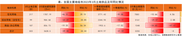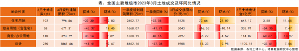 从地块性质来看,3月仅综合用地(含住宅)成交规模及土地收金较上月齐升。数据显示,3月纯住宅用地成交规划建筑面积为796.56万㎡,同比下跌39.3%,环比下跌12.83%;综合用地(含住宅)成交规划建筑面积为671.31万㎡,同比下跌45.37%,环比上涨19.45%;商办用地成交规划建筑面积为393.79万㎡,同比下跌38.14%,环比下跌9.89%。另外,各类用地一季度成交规模均不及去年同期,跌幅均超30%。