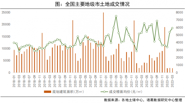 从3月单月土地成交来看,3月土地成交量稳价升,成交规模环比降幅不超3%,土地收金较上月上升。据诸葛数据研究中心监测,2023年3月全国主要地级市土地成交280宗,成交规划建筑面积为1861.66万㎡,同比下降41.41%,环比下降2.67%;成交楼面价为5908元/平方米,同比上涨13.33%,环比上涨9.98%;土地出让金为1100.15亿元,同比下降33.61%,环比上涨7.06%。