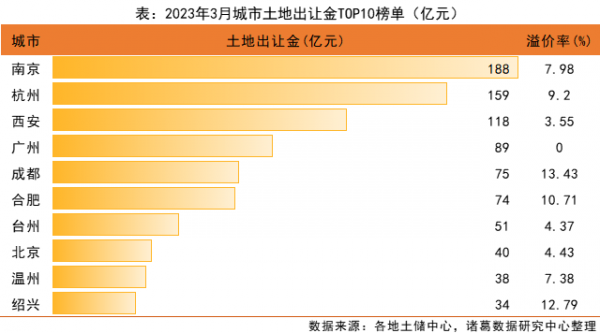 热点城市收金可观。3月南京以188亿元高居土地出让金榜首,杭州、西安的土地收金表现也较为亮眼,2城分别以159亿元、118亿元位列第二、三。