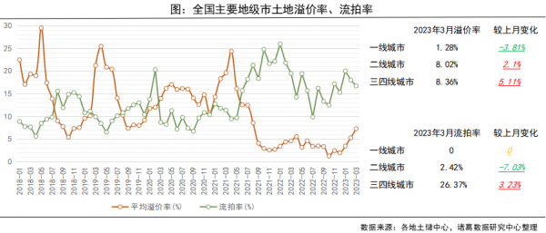 从3月单月来看,2023年3月全国主要地级市溢价率为7.23%,环比上升2个百分点,同比上升2.69个百分点。自去年5月起,土地溢价率高位回落,去年9月进入低位水平。进入2023年,土地市场逐步回温,溢价率连续3月上升,尤其是杭州、成都等热点城市土拍升温明显,溢价率均在9%以上水平,提升了土地市场整体溢价空间。流拍率方面,本月流拍率为16.67%,较上月下降1.3个百分点。分等级城市来看,一线城市本月溢价水平靠后,入年以来无流拍,二线城市高溢价与低流拍并存。溢价率方面,一二线城市溢价率降至1.28%,二线、三四线城市溢价率双双上升,均处于8%以上水平。流拍率方面,一线城市仍无流拍现象,二线城市流拍率持续回落至2.42%,三四线城市流拍率较上月上升3.23个百分点。