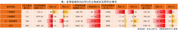 3月三四线城市土地成交148宗,土地成交规划建筑面积为870万㎡,同比下跌50.73%,环比下跌15.6%;成交楼面价为2945元/㎡,同比上涨17.14%,环比上涨51.26%;土地出让金256.57亿元,同比下跌42.28%,环比上升27.81%。一季度三四线城市成交规划建筑面积3132.36万㎡,同比下跌45.84%。当前三四线城市土地成交端呈现“价格涨势坚挺,成交略显疲态”的特征。