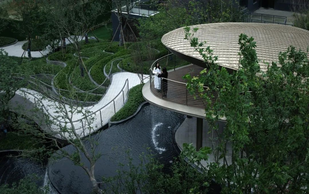 通过水景、绿植的元素诠释人与自然的和谐共生。绿树浓萌、水中沙发、叠瀑水景……勾勒出典雅清静、自然清新的闲居场所,形成独特的观赏空间。