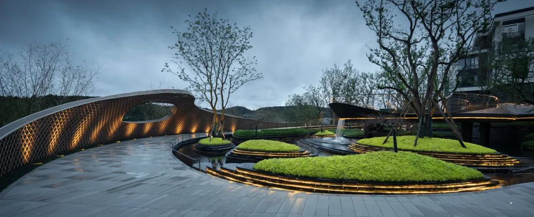 城市霓虹虽美,但真正打动人心的还是那份简单与自然,行至长桥卧波处,溪流在侧,一边则为长约40米的金属艺术景墙,感受吹来的微风,一半是自然,一半是尘世;一半是生活,一半是诗意。