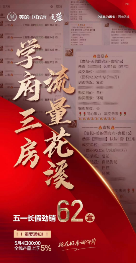 5月3日晚间,贵阳美的国宾府对外发布业绩战报,其五一期间劲销62套。同时,5月4日00:00起,其全线产品价格上浮5%。
