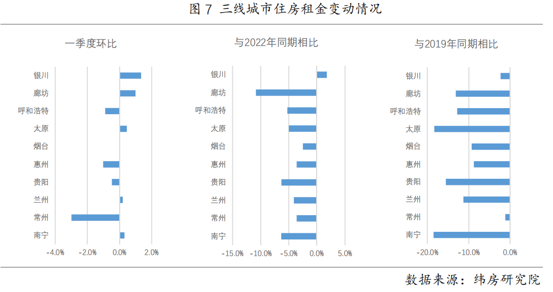 三线城市5一季度住房租金呈现分化态势。重点40城中10个三线城市,一季度住房租金涨跌参半。其中,银川、廊坊、太原、兰州、南宁和烟台租金微涨,常州、惠州、呼和浩特和贵阳租金微跌。与去年同期相比,银川住房租金同比上涨,其余城市下跌。其中,廊坊住房租金跌幅为10.85%。