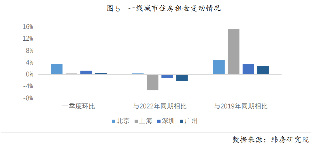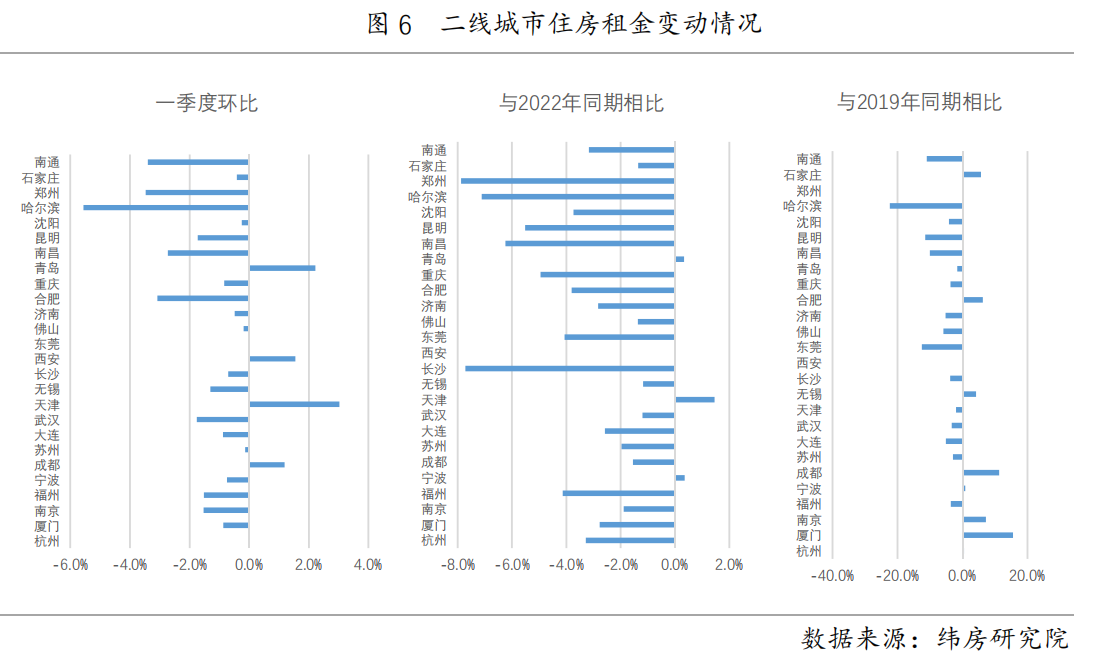 从租金水平来看,纬房研究院数据显示,一季度重点40城中15个城市住房租金环比小幅上涨,25个城市住房租金环比下跌。与2022年一季度相比,仅有5个城市住房租金同比上涨,其余342个城市住房租金同比下降。