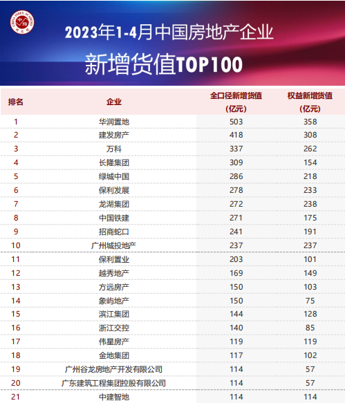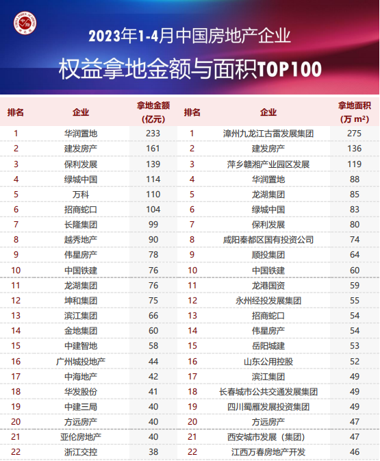 近日,中指数据对外发布2023年1-4月中国房地产企业权益拿地金额与面积TOP100,华润建发万科分列三甲。