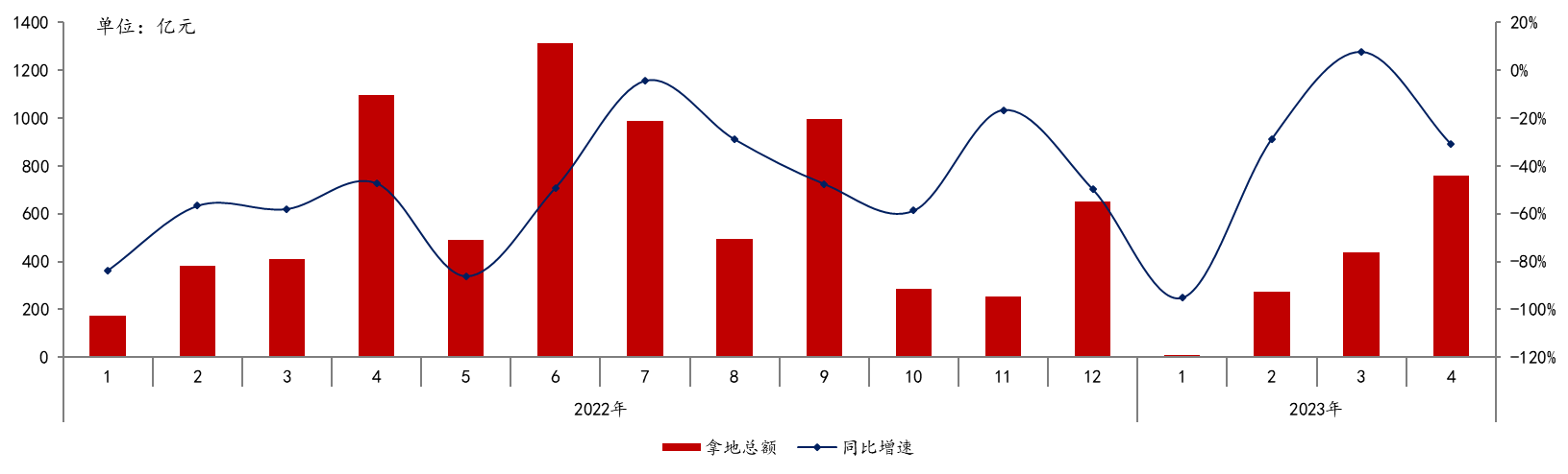 图:2022-2023年4月50家代表房企每月拿地总额