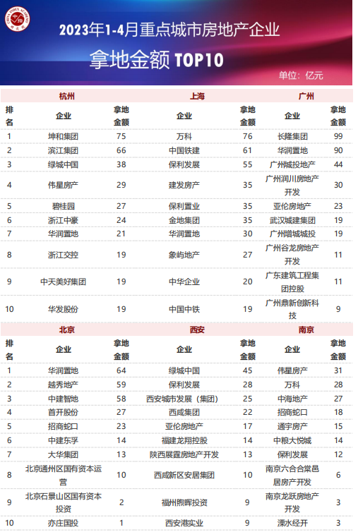 从重点城市拿地金额TOP10房企来看,央企国企仍是主力。华润置地、万科、绿城、保利发展等全国性龙头企业仍在多个重点城市广泛布局,央国企参与热度较高,重点城市拿地金额TOP10房企中有半数以上为央企国企,这与稳健型国央企的资金状况相对较好有直接关系。民营企业中,坤和集团占据杭州市拿地金额榜首。