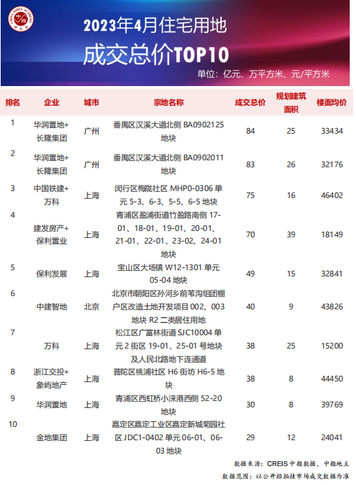 从全国住宅用地成交总价TOP10来看,4月入榜地块中多数位于长三角地区,成交金额门槛为29亿元。入榜地块中,番禺区汉溪大道北侧BA0902125地块以总价84亿元位居榜首,上海共入榜7宗地块,总成交金额为329亿元;广州入榜2宗地块,总成交价为167亿元;北京入榜1宗地块,总成交价为40亿元。