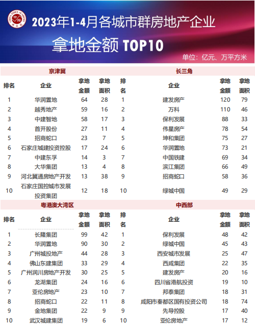 从各城市群拿地金额来看,长三角地区领跑全国。2023年1-4月,长三角TOP10企业拿地金额786亿元,居四大城市群之首。其中,建发房产拿地金额为120亿元,位居长三角企业拿地金额榜首;粤港澳TOP10企业拿地金额406亿元,位列第二;京津冀TOP10企业拿地金额299亿元,位列第三。拿地面积来看,长三级TOP10企业拿地面积以408万平方米位居四区域首位,超越中西部TOP10企业。