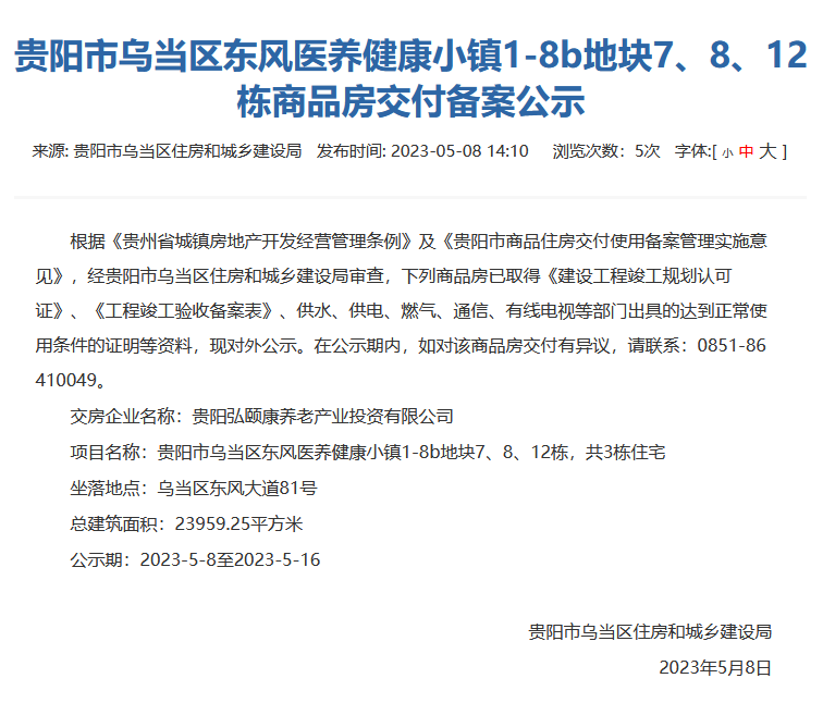 5月8日,贵阳市乌当区住房和城乡建设局发布交付备案公告,贵阳市乌当区东风医养健康小镇1-8b地块7、8、12栋,共3栋住宅已取得《建设工程竣工规划认可证》、《工程竣工验收备案表》、供水、供电、燃气、通信、有线电视等部门出具的达到正常使用条件的证明等资料,现对外公示。
