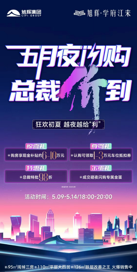 5月9日-14日,贵阳旭辉学府江来五月夜闪购启动,狂欢初夏四重礼来袭。