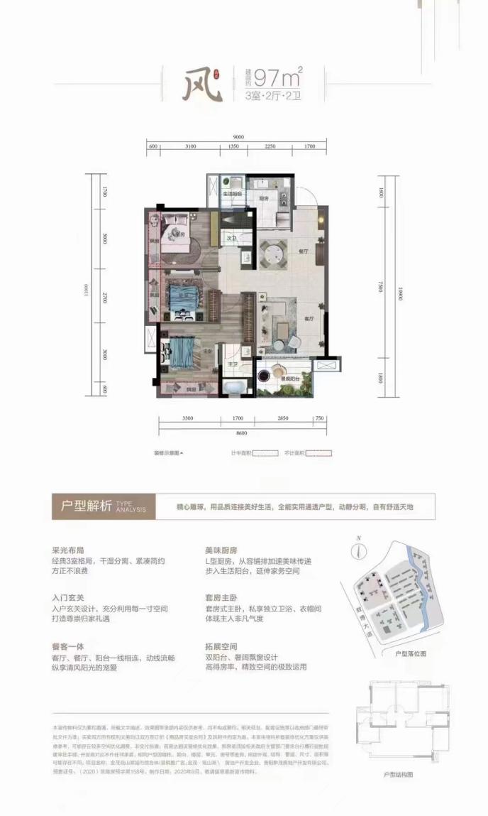 建面约97平三房两卫户型,经典3室格局,干湿分离,紧凑简约,方正不浪费;L型厨房,从容铺排,加速美味传递,步入生活阳台,延伸家务空间;入户玄关设计,充分利用每一寸空间,打造尊崇归家礼遇;套房式主卧,私享独立卫浴、衣帽间,体现主人非凡气度;餐客一体,客厅、餐厅、阳台一线相连,动线流畅,纵享清风阳光的宠爱;双阳台、奢阔飘窗设计,高得房率,精致空间的极致运用。